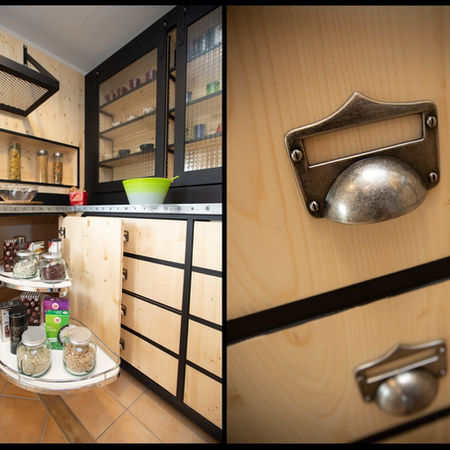 Cuisine en Epicéa massif sur le thème des "meubles de mercerie" avec son îlot en forme d'établi de menuisier et sa grande armoire de rangement.