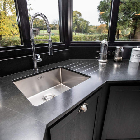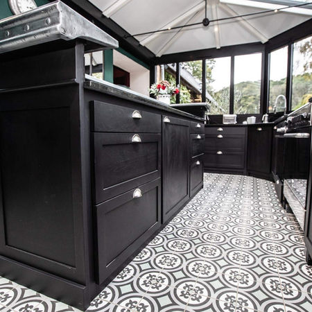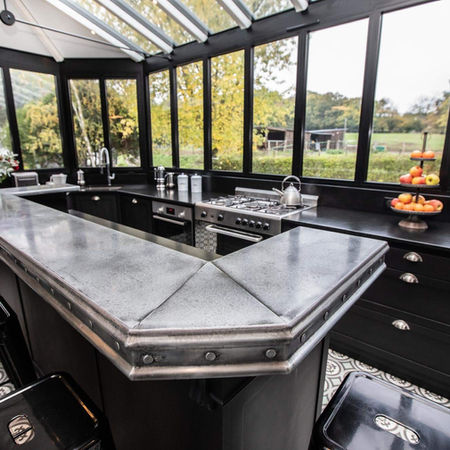 Réalisation d'une cuisine en bois noir avec bar en zinc pour une vérande