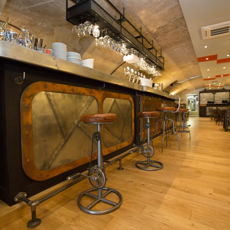 Nous avons entièrement imaginé ce mobilier dans un esprit industriel en utilisant des tuyaux de plomberie en fonte, du zinc et de la rouille. L'ensemble est totalement unique et permet de signer un établissement remarqué qui est vite devenu LE restaurant de la ville.